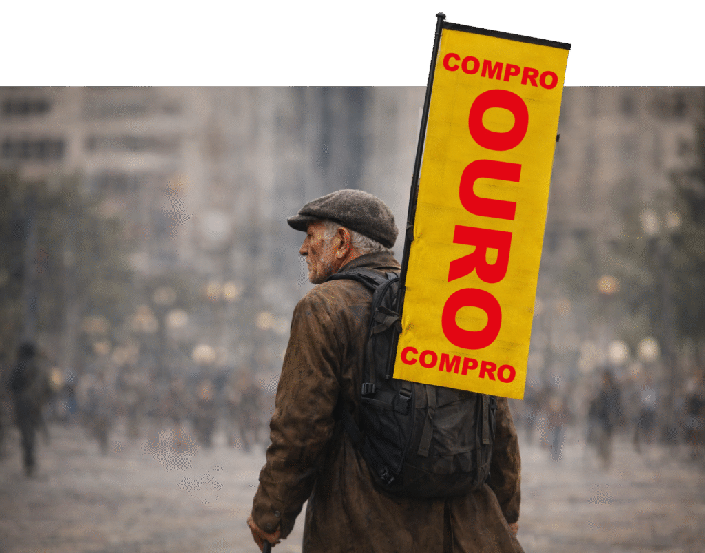 COMPRO OURO! QUEM SE LEMBRA DOS VELHINHOS, GENTE HUMILDE que precisava de algum meio de vida e que ostentavam placas com esses dizeres? Eles eram placas ambulantes, muito longe de poderem ostentar qualquer outra coisa em vida.
